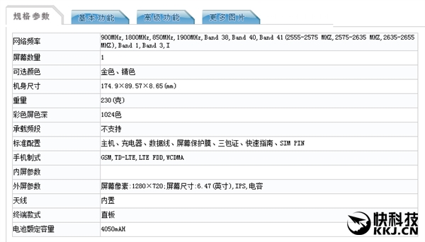 该机的似乎并非金属机身,厚度8.65毫米,重量230克,屏幕虽有6.47寸但分辨率仅为720p,边框倒是很窄,金色、锖色两种风格。