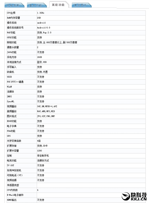 四核1.3GHz处理器、2GB内存、16GB可扩展存储、800+500万像素摄像头、4050mAh电池、安卓6.0操作系统,但移动网络仅支持联通3G、双4G。