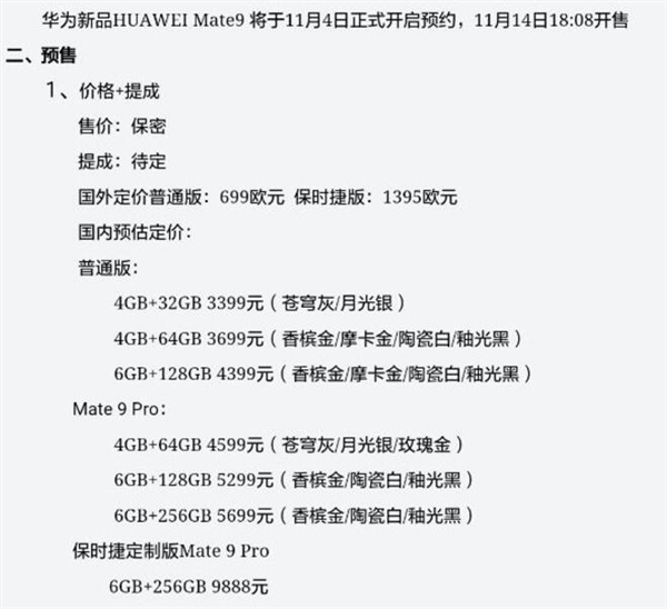 曲面屏版本在国内会命名为Mate 9 Pro,4+64GB售价4599元,6+128GB售价5299元,6+256GB版则是5699元。而保时捷定制版在国内的价格则高达9888元。
