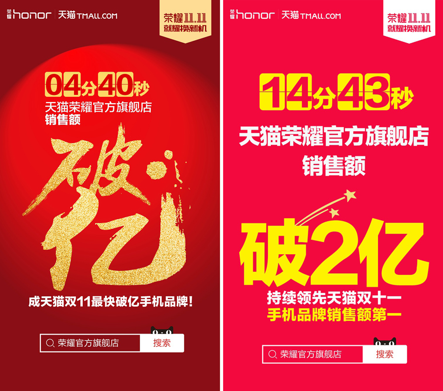 11月11日凌晨00:09,荣耀手机宣布:4分40秒,天猫荣耀官方旗舰店销售额破亿!成天猫双11手机品类最快破亿品牌!
