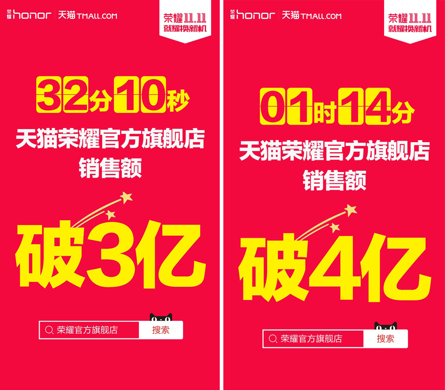 00:34,荣耀手机:32分10秒,天猫荣耀官方旗舰店成交额破3亿!