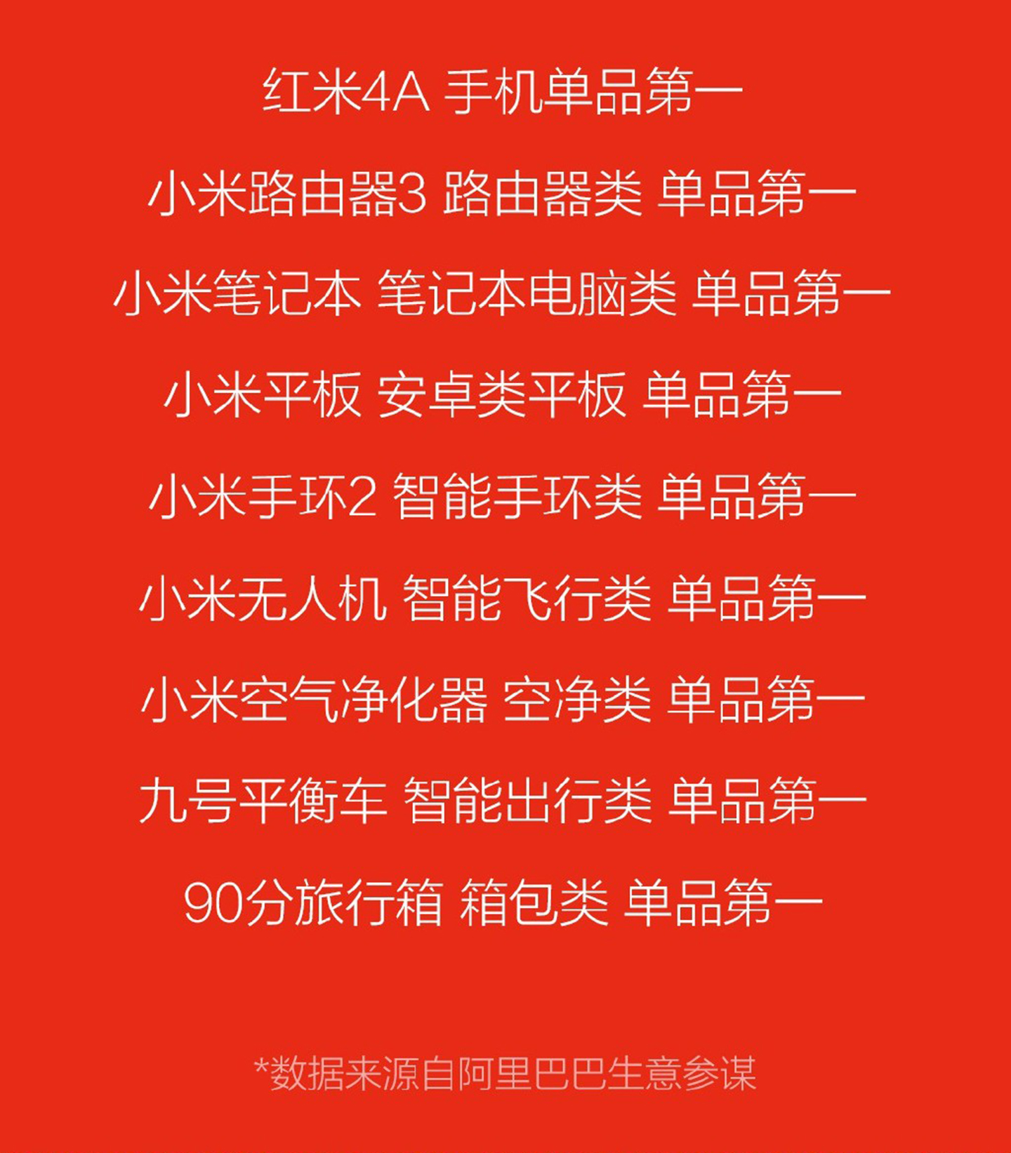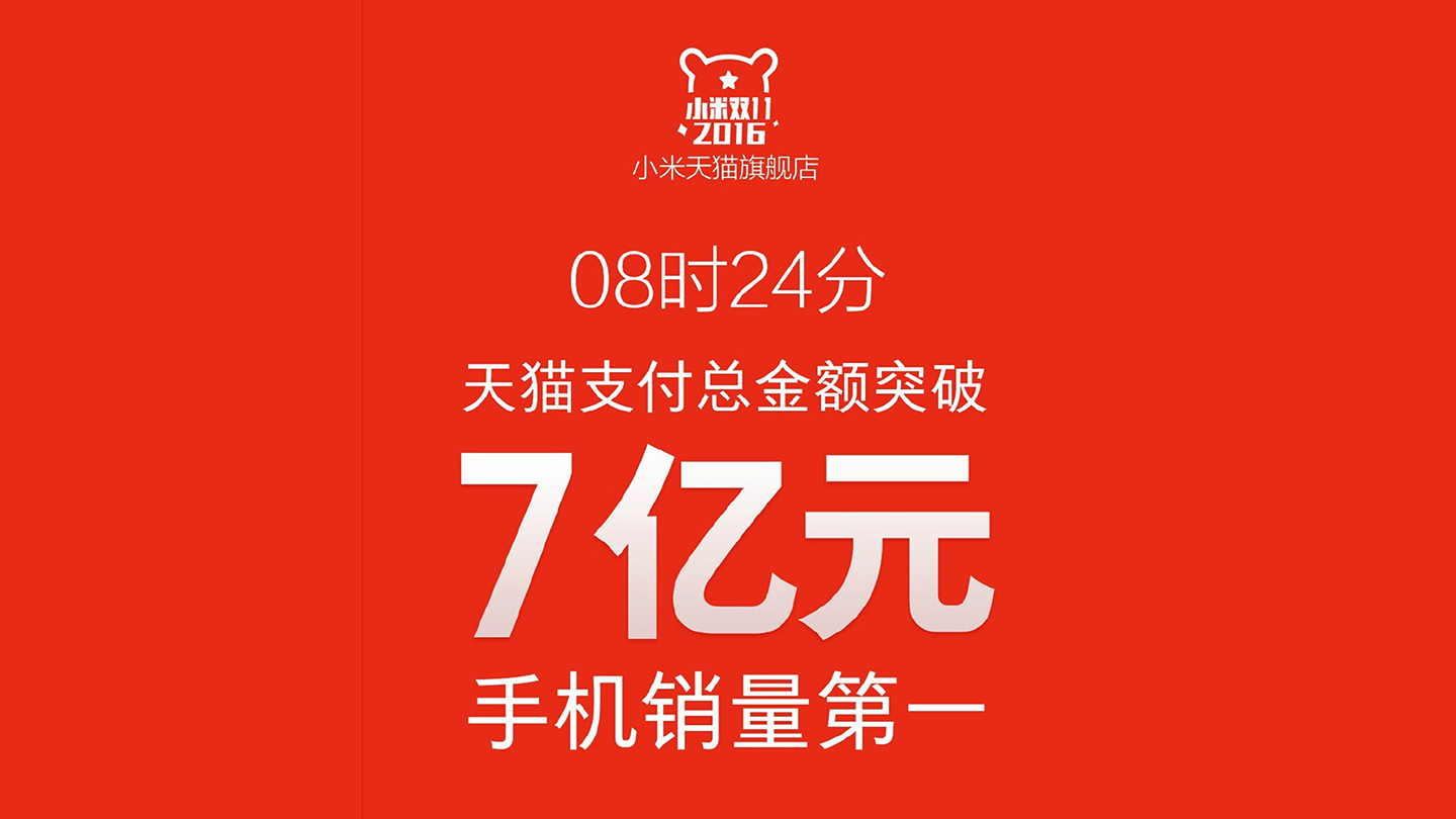 09:54,小米手机再次宣布:8点24分,小米天猫旗舰店支付破7亿!天猫手机销量第一!红米4A手机单品第一,路由器类单品第一,笔记本电脑类单品第一!战绩耀眼!