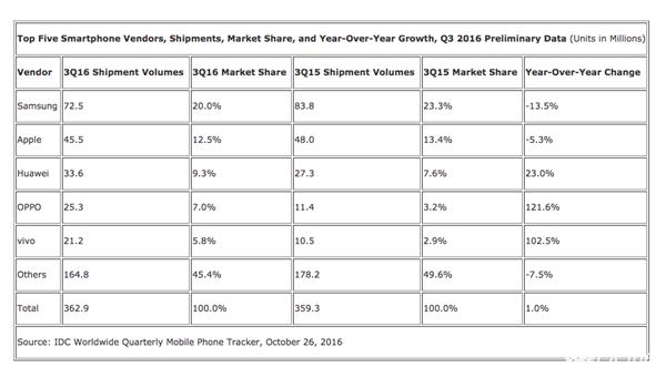 今年第三季度,华为、OPPO 、vivo继续位列全球五大智能手机厂商