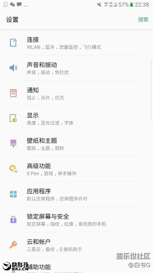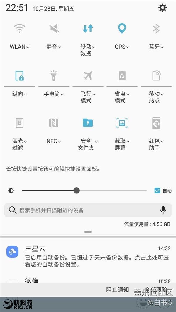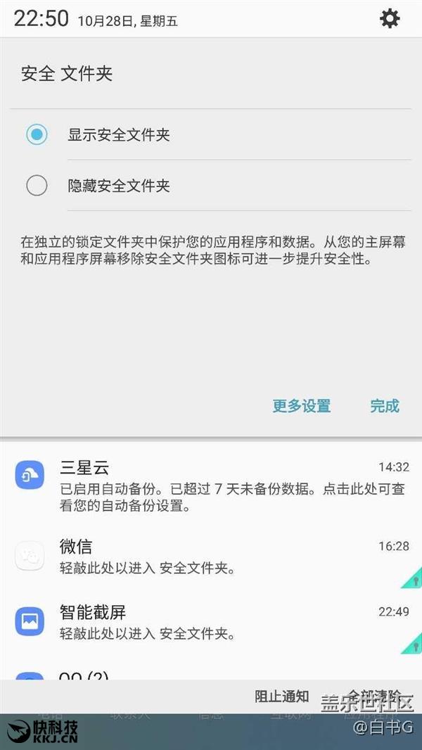 从曝光的UI截图来看,基于安卓7.0的新UX以白色为主色调,图标风格更加统一,而且大幅度提高了流畅度,Knox更名为安全文件夹、能自定义息屏预览等。