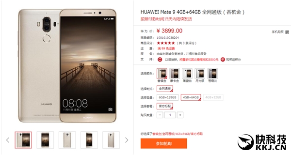 目前在华为官方商城中,Mate 9标准版已经先行上架,三种配置可选其二4GB+64GB、6GB+128GB,但选择抢购之后,都会跳转到4GB+32GB最低配。