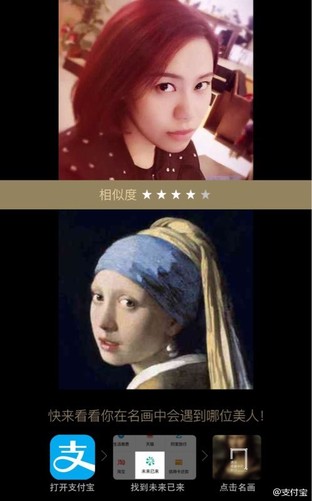 据悉,这个测试基于支付宝的人脸识别技术支持,系统可在2000多幅人物名画库中找到与自拍照片相似度最高的经典作品中的人物,并介绍这一作品的相关信息,整个过程仅需3秒钟。