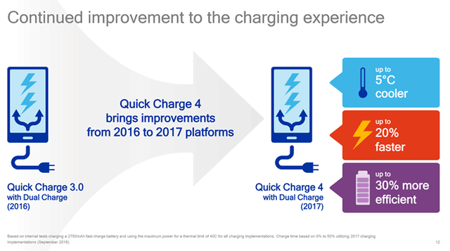 而快充方面,新的QuickCharge 4.0将在保持与3.0相同的最高18W充电功率上面速度提升20%。