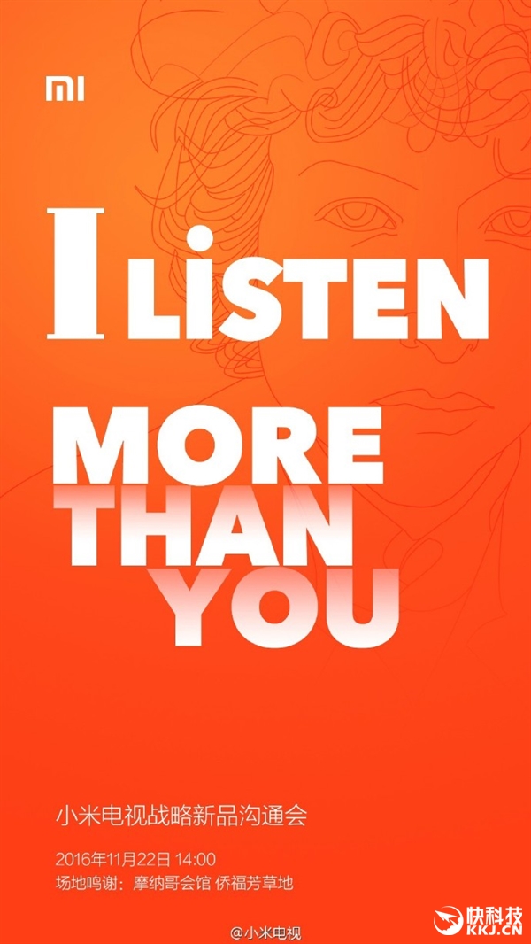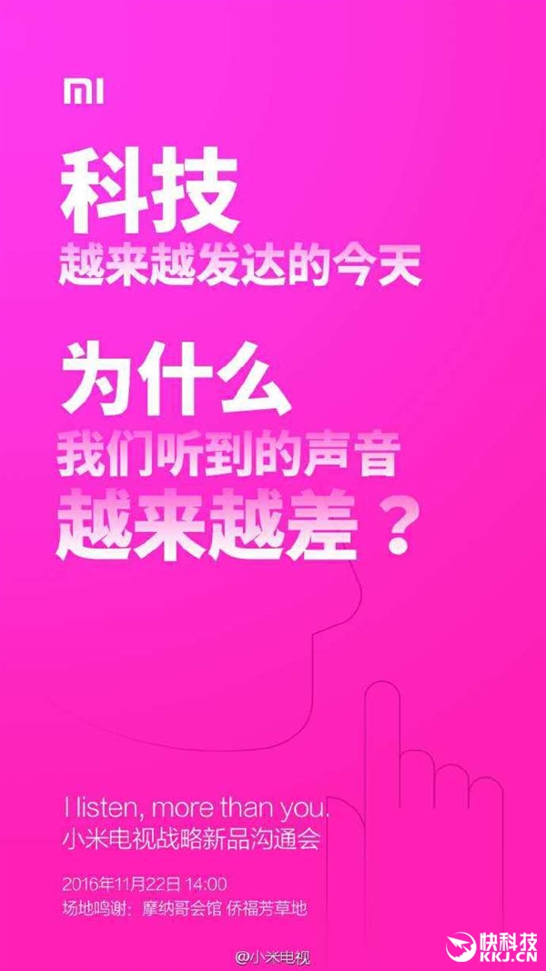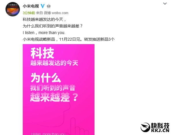 接下来,小米电视还将有一款重磅新品发布,经过昨天的预告之后,@小米电视 官方今日再次放出预告海报,并发文称:“科技越来越发达的今天,为什么我们听到的声音越来越差?I listen,more than you.小米电视战略新品,11月22日见。”