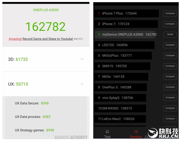 下面来看跑分,AA在安兔兔跑出了162782分,目前安卓最高,另外下面是对比一加3的其他成绩——