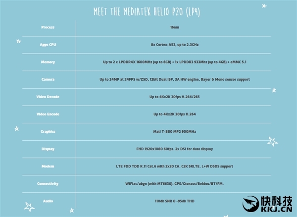 其他规格方面,Helio P20还支持最高1920×1080/60fps屏幕分辨率、最高2400万像素单摄像头或1300+1300万像素双摄像头(12位双ISP)、最高4K×2K/30fps H.265/H.264视频解码、最高4K×2K/30fps H.264视频编码、LTE Cat.6全网通(2×20MHz载波聚合)、802.11ac。