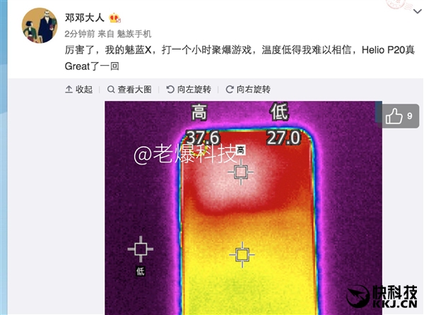@邓邓大人 明确提到了魅蓝X、Helio P20,并称打了一个小时《聚爆》游戏,“温度低得我难以相信”。