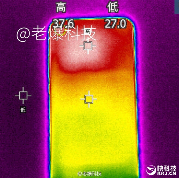 他还附上了一张热成像图,显示手机上方温度最高的地方也只有37.6℃,而低温的地方仅仅27℃。