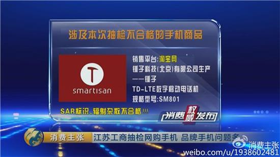 标称锤子SM801的一款手机SAR标识和辐射杂散不合格;联想和中兴各三款手机标称值不合格;