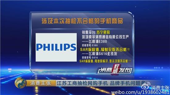 标称飞利浦E380的一款手机SAR标称值、辐射杂散不合格,一款S616玄铁灰款的手机SAR标称值、电池的标识和警示说明不合格;