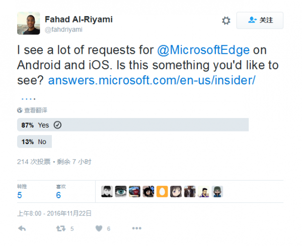 而微软方面并非在刻意无视该问题。近日,微软技术策略官Fahad Al-Riyami在Twitter中进行了一次投票调查,结果,87%的网友希望微软能够在安卓以及IOS系统中推出Edge浏览器。