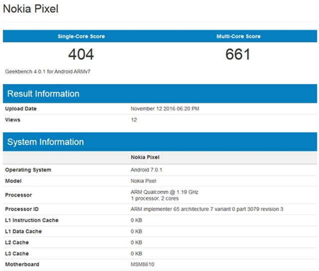 据外媒报道,诺基亚日前已经表示将会出席MWC2017大会,并且还会推出多款硬件产品。日前,GeekBench的数据库中就出现了诺基亚Pixel的信息,不过这手机的配置并非想象的那样。