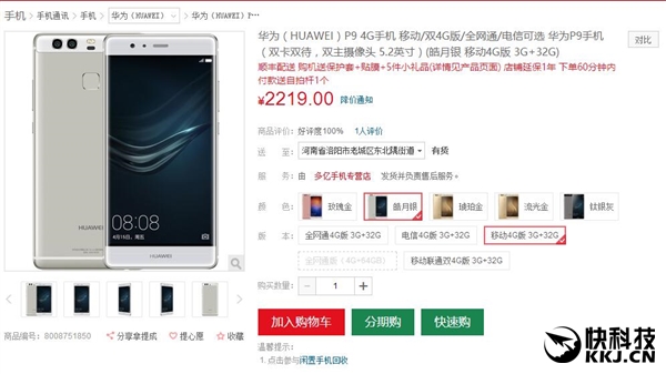 而在国美在线,卖家将P9的价格下调到了2219元起,同样的版本在华为官网价格为2699元。