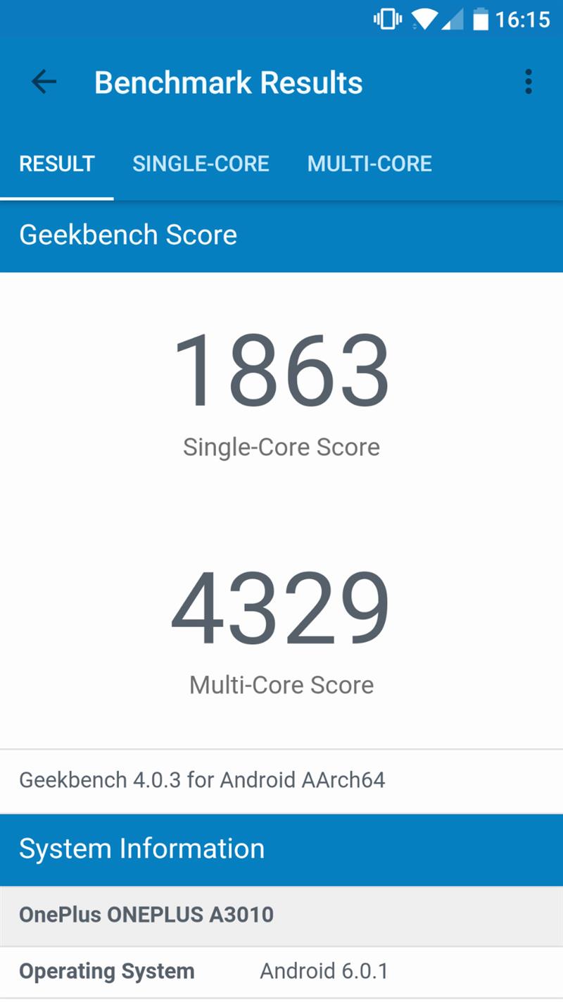 而在Geekbench4测试中,一加手机3T的单核得分是1863,多核得分是4329。