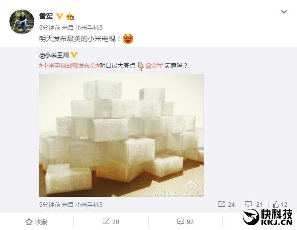 昨天,小米董事长雷军还发布微博透露,要“发布最美的小米电视”。