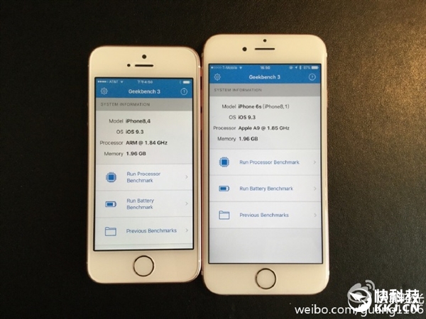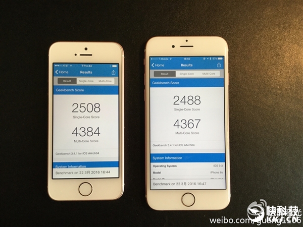 就在刚刚,已经拿到iPhone SE真机的新浪编辑郭晓光在微博上晒出了两张图,是它的Geekbench 3的跑分图,一同对比的是iPhone 6S。