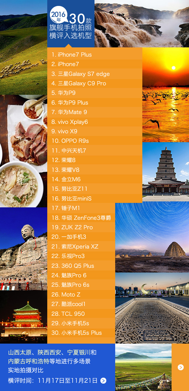 2016年即将结束,继50款手机续航横评、30款手机散热横评之后,我们再次推出重磅横评项目——2016年30款旗舰手机拍照横评。与以往不同,本次横评会横跨4000公里,在11月17日-22日为期6天的时间里,驱车前往太原壶口瀑布、西安美食、银川西夏王陵、呼兰浩特乌兰察木草原,来完成多个项目的样张拍摄。最终,我们认为在今年三星Galaxy S7 edge、华为P9、iPhone 7/7 Plus、OPPO R9s和vivo Xplay6这几部手机,在拍照方面有理由推荐给你。