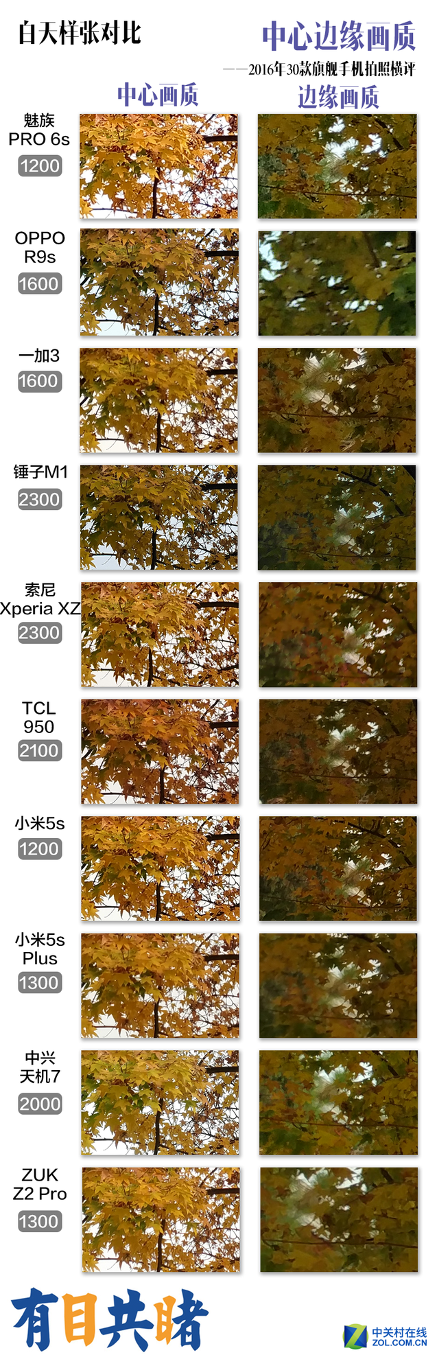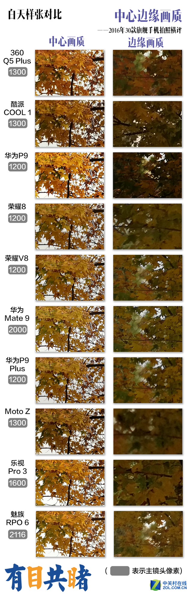 智能手机当然不能对这样的极限表现要求过于苛刻,不过我们还是来简单看看各款手机的边缘画质相比中心画质来说,劣化程度如何。(由于焦距不同,对比部分未包含在某款机型取景范围内的取相近部分,360 Q5 Plus、荣耀8、Moto Z、乐视Pro 3、OPPO R9s几款受此影响,边缘画质不具备参考价值)
