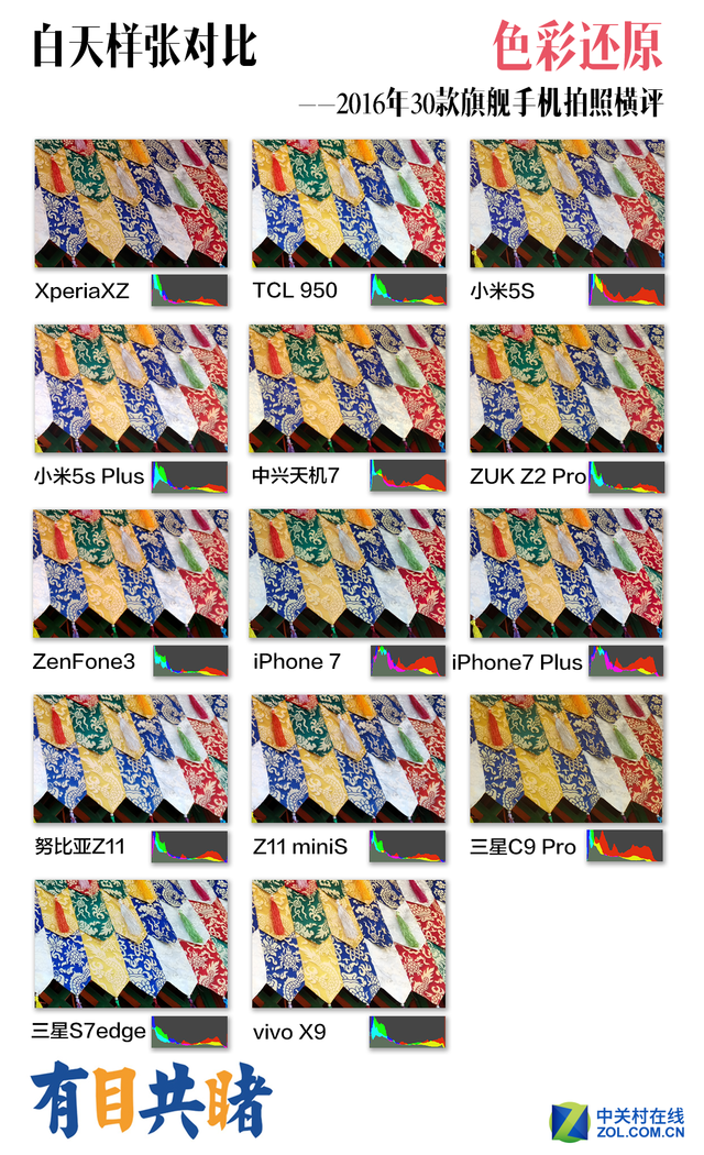 色彩偏向鲜艳风格的有 华为P9(鲜艳模式)、努比亚Z11、OPPO R9s、vivo Xplay6