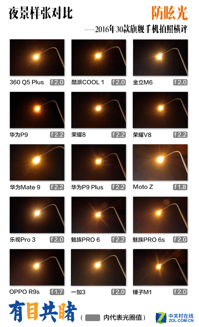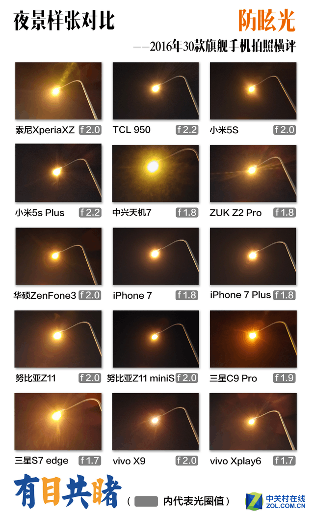 实际效果来看,大光圈还是能够体现先天优势的,光圈值为f/1.7的OPPO R9s、三星Galaxy S7 edge、vivo Xplay6的三款机型都有虚化程度最高的效果,其次为光圈值f/1.8的iPhone 7以及iPhone 7 Plus。而比较普遍的f/2.0 2.2光圈的机型当中,一加3、锤子M1、华为Mate 9、TCL 950、小米5S虚化效果不错,也有直径较大较清晰的弥散圆出现。