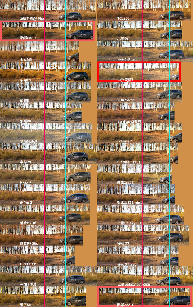 上图中红线是测试参照物“大树”,蓝色线则代表本组最车头最靠左车辆(即快门反应最快机型),通过参考线很容易就能对比出哪些机型快哪些机型慢,右侧最下方机型为左侧快门反应最快机型作为参考,在该场景中我们发现中兴天机7快门反应速度最为灵敏,iPhone 7/7 Plus次之。
