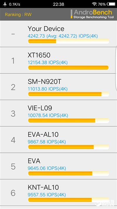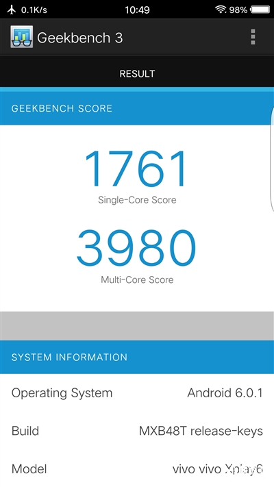 此外,Xplay6接受Geekbench 3的测试成绩是,单核1761、多核3980,这是骁龙820的正常水平,而Androbench测试它128GB UFS 2.0的成绩是,4K随读119.11MB/s、4K随写16.57MB/s,还是比较满意的。