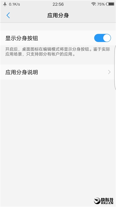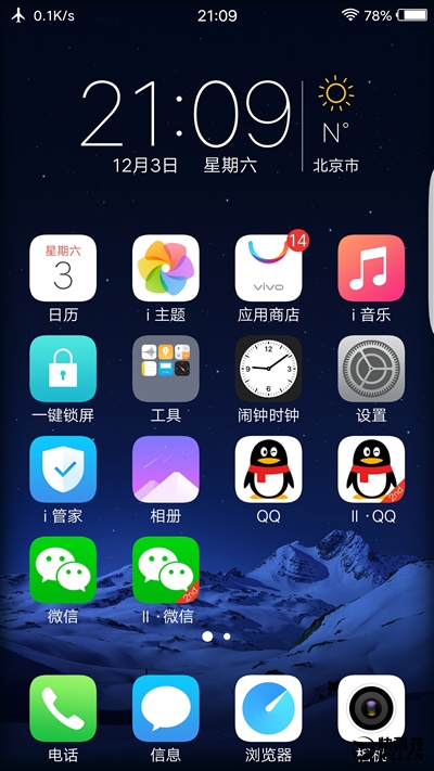FuntouchOS 3.0主界面,微信、QQ的分身更简单,长按图标后点击上面的+号即可。