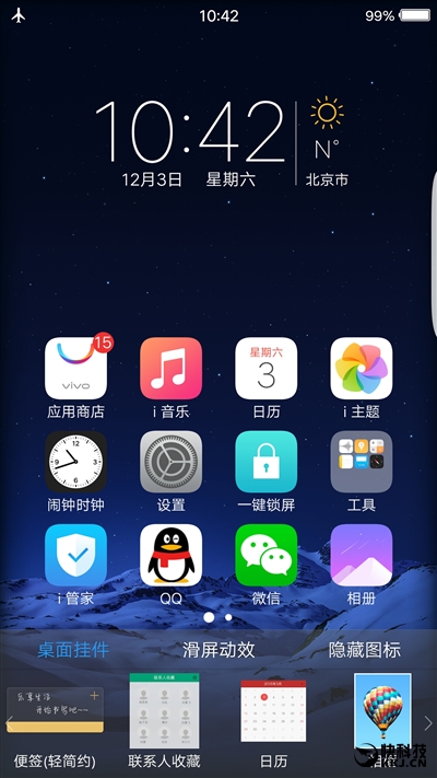 FuntouchOS 3.0一上手的感觉就是这界面“很熟悉”,大家是不是同样的感觉?没错,在新的UI设计上,vivo把风格紧贴iOS,重新绘制了系统的图标,配色上更清新和鲜明,而毛玻璃元素也是被多次运用,比如底部上拉的快捷栏和下拉通知栏等,这个设计能让用户的视觉体验层次感更强,接受起来更平和不会那么突兀。