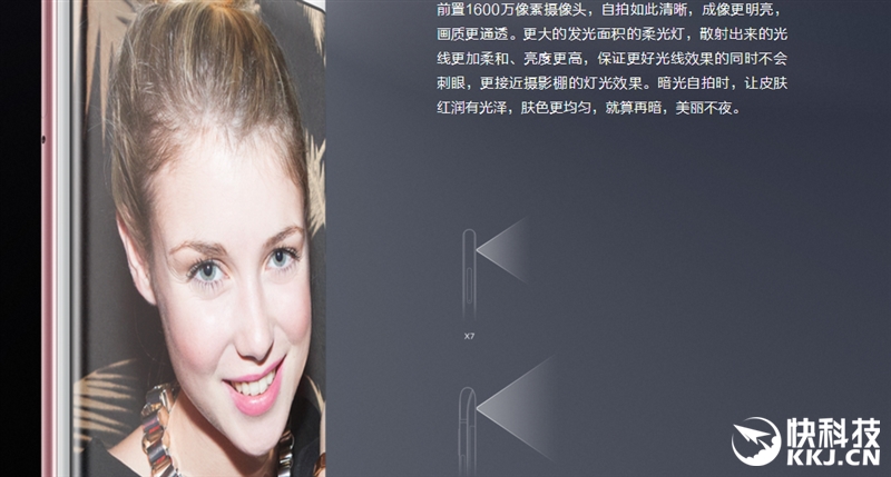 Xplay6前置摄像头是1600万像素(光圈为F/2.0、支持美颜自拍以及弱光自拍),为了方便妹纸的自拍,其加入了柔光灯,但跟X7上的那颗柔性光灯相比,这个照射的面积更大,且光线更柔、更亮、分布也更均匀了。