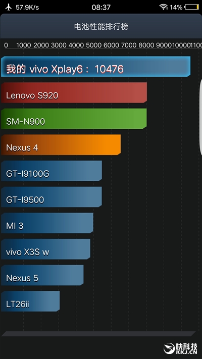 在接受安兔兔超过7小时的电池耐力时,Xplay6电量从100%降到了120%,最终得分为10476分,这对于搭载骁龙820和2K屏的旗舰机来说,这个成绩还是让人满意的(重度用户至少一天一充是完全没问题的)