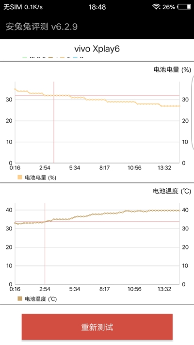 快充的意义在于,用户可以利用碎片化时间来对设备进行充电,所以效率的高低很重要。Xplay6从0到100%需要128分钟左右,这个成绩跟目前支持QC3.0快充技术的手机相比,vivo还是显得有些保守(应该是把安全放在第一位),而手机从0到20%时间是17分钟,40分钟可以充电45%,这个速度只能可以接受。