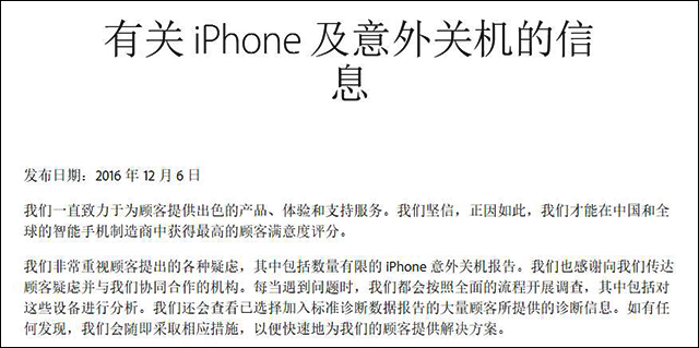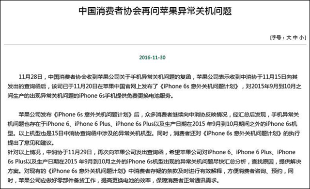 在苹果公布iPhone 6s意外关机解决方案之后,11月30日中国消费者协会再次向苹果发出查询函,希望苹果公司对iPhone 6、iPhone 6 Plus、iPhone 6s Plus以及生产日期在2015年9月到10之外的iPhone 6s机型出现的异常关机问题尽快汇总分析,查找原因,提供解决方案。如今,苹果官方对此事再度做出回应。
