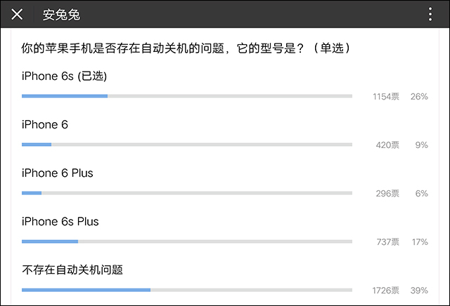 遗憾的是,“受影响范围之外”苹果手机出现意外关机的解决方案,苹果官方在此次回应中并没有提及。事实上,兔兔发起的调查报告数据显示,除了iPhone 6s之外,有限的样本量中依然有不少iPhone 6、iPhone 6 Plus以及iPhone 6s Plus用户表示自己的手机存在自动关机的状况。这样的问题确实存在。我们期待,关于这部分用户,接下来苹果官方能够尽快给出合理的解决方案。