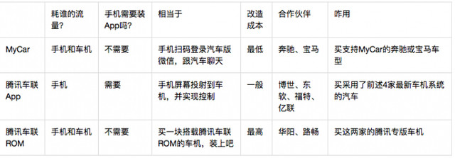 车联 APP 类似于苹果 Carplay,将手机连接到车机,手机上的内容映射在车机上。不过它主要针对尚未联网的车机,用户下载手机端的 APP 后,通过 USB 或者 WiFi 将手机和车机进行互联。地图、信息和社交内容可以通过第三方通道显示到车载屏幕上,用户可以在车机或者手机端进行操作。腾讯车联 APP 的首批合作伙伴为博世、东软、福特、亿连。