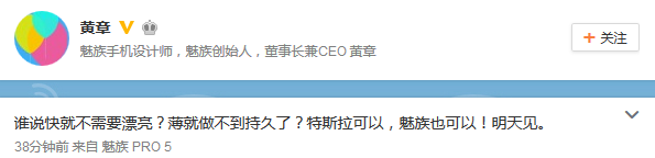 黄章在微博上称“谁说快就不需要漂亮?薄就做不到持久了?特斯拉可以,魅族也可以!明天见”。之前有消息称,魅族会在4月份举行新品发布会,按照这个节奏来看的话,明天应该是公布这个消息。