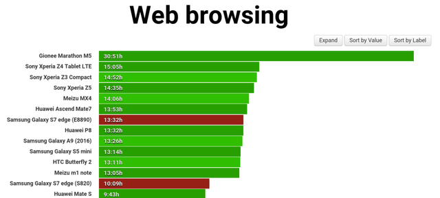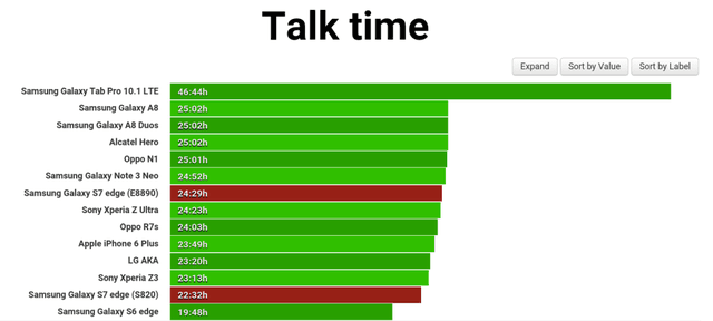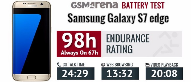 具体来讲,搭载三星自家Exynos8890处理器的S7 edge在GSMArena的规范测试中取得了98小时的成绩,而搭载骁龙820版本的S7 edge则仅有87小时,尽管这个成绩相比其他机型已经很优秀,但依然和前者有11小时的差距。
