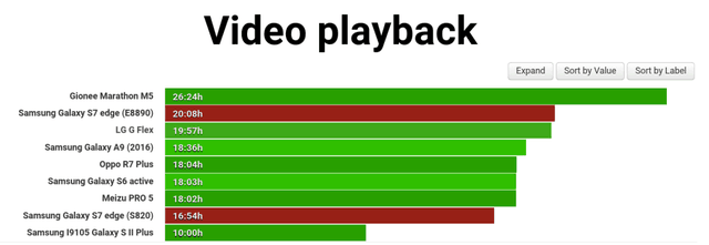 视频连续回放时间,Exynos版比广告宣传的18小时的时间更久,达到20小时8分钟,仅次于超大容量电池的金立M5手机,但同为搭载省电的Super AMOLED屏幕的骁龙820版本S7 edge的这一成绩则只有16小时54分钟,相差3个多小时,令人唏嘘。