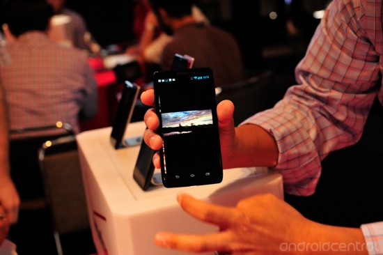 First up, the Droid Ultra. Built with a Kevlar body and 3D design, it's the thinnest smartphone available. Following is the Droid MAXX, also built of Kevlar and 9-percent thinner than last year's model yet still delivers 48-hours of battery life (up from last years 32 hours). The Droid Mini offers the same great software in a more compact size.