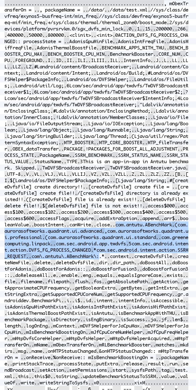 At this point the benchmarks allowed to run at higher GPU frequencies would seem arbitrary. AnTuTu, GLBenchmark 2.5.1 and Quadrant get fixed CPU frequencies and a 532MHz max GPU clock, while GFXBench 2.7 and Epic Citadel don’t. Poking around I came across the application changing the DVFS behavior to allow these frequency changes – TwDVFSApp.apk. Opening the file in a hex editor and looking at strings inside (or just running strings on the .odex file) pointed at what appeared to be hard coded profiles/exceptions for certain applications. The string "BenchmarkBooster" is a particularly telling one: