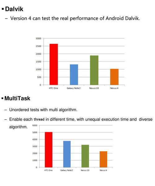 AnTuTu Benchmark V4.0 focuses on user experience. In order to do a better benchmark, we add multitask test and Dalvik test to make the scores more close to the user experience in daily usage.