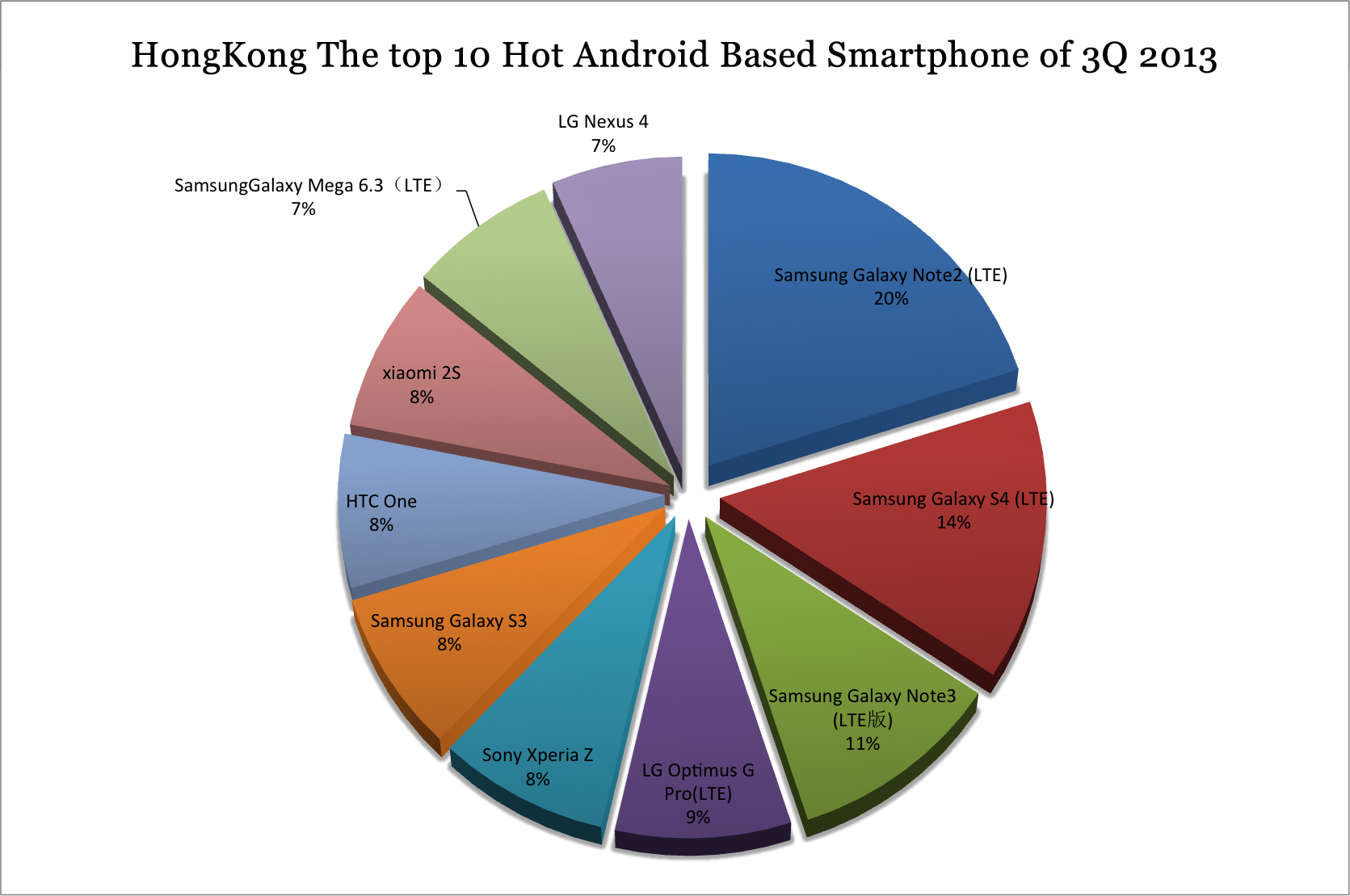 Unlike the users in mainland China who are the fans of Samsung and Xiaomi both , the users in HK are big fan to Samsung only. Samsung takes five in top ten list. LG has two entered the list too which are Optimus G Pro/Nexus 4. The rest are Xperia Z, XiaoMI 2S and HTC One.