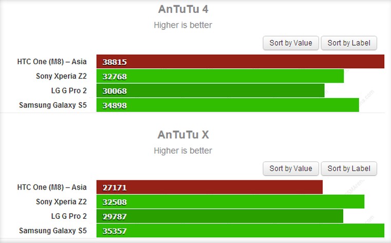 It is reported from Phonearena, compared benchmarks in both the AnTuTu 4.0 and the AnTuTu X app , different results were found for the Asian HTC One (M8) model. The model scored 38,815 in AnTuTu, but just 27,171 in AnTuTu X. The site also tested the LG G Pro 2, the Galaxy S5 and the Xperia T2 finding similar scores for each device in the two benchmarks, like 32000,30000 and 35000.