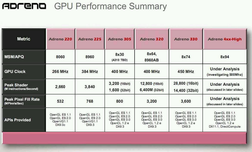 With the adjustment in fragment shader, the different between Adreno305 and Adreno320,Adreno320 and Adreno330 is becoming obviously.Adreno4x0 will make its most advantage on GPU performance in the coming future.