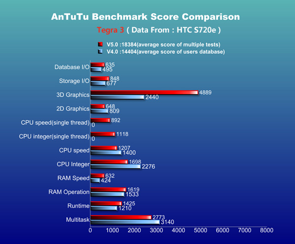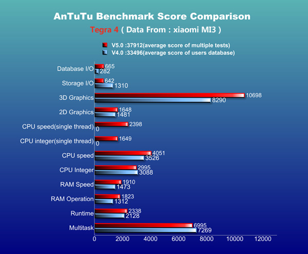 NVIDIA tegra3 is not a new chip in these days but still has its advantage in GPU part on V5.0. Of course NVIDIA has its weakness in CPU.After Antutu this update, its score raised from 8290 to 10698,with total score 37912. If we see snapdragon 800(V5:38164) at the same time, the score on tegra3 has not changed too much. That also means NVIDIA, which is weighting GPU part, does not gain too much benefit on the V5.0 update. However, it is said that the Antutu score of K1 is over 50K,which is really amazing score.