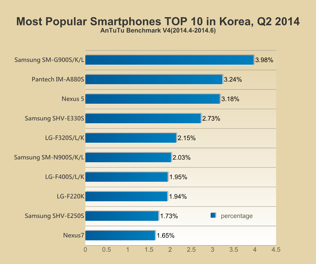 Antutu released series reports of the most popular smart phones last quarter,2014. Large amount of new devices entered into market in April and the ranking of Antutu also has some change. Antutu database has received 10635159 scores device score information in second quarter, 5698587 from mainland China and others from all over the world, with valid statistics in 155 countries. Let’s see the overall trending of popular smartphone in some main countries and areas outside China first.